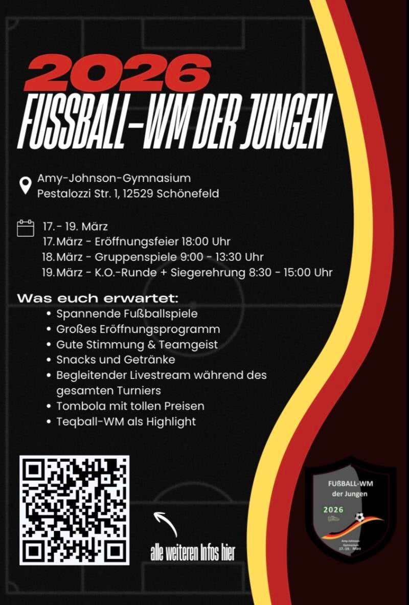 Für die Fußball-WM der Jungen 2026 suchen wir nicht nur Mannschaften aus Berlin, sondern auch Teams aus allen anderen Bundesländern sowie aus dem Ausland. Wir sind offen für alles und freuen uns über jede Schule, die Lust hat, Teil dieses besonderen Turniers zu werden.